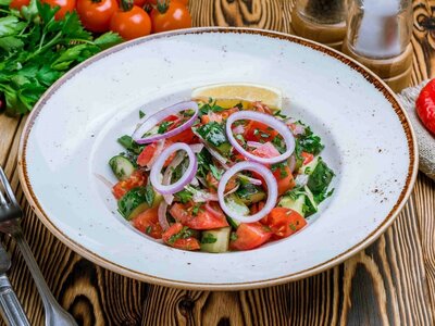 Погрузитесь в атмосферу восточного колорита с нашим салатом, который порадует вас сочностью узбекских томатов, свежестью огурцов и пикантностью красного лука, а зелень добавит блюду изысканный аромат и лёгкую пряность