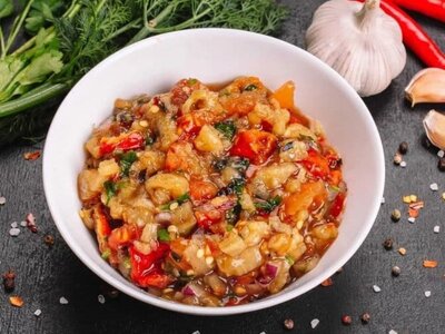 Сочный салат с запечёнными баклажанами, помидорами и болгарским перцем. Острый перец и чеснок добавляют пикантности, а оливковое масло и специи гармонично объединяют все вкусы. Мангал салат — отличное дополнение к мясным блюдам