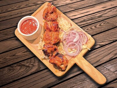 Сочное мясо с лёгкой хрустящей корочкой. Кусочки куриного бедра хорошо прожарены, но остались нежными. Шашлык из курицы обладает приятным ароматом и умеренной пикантностью.