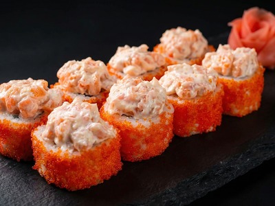Ролл с лососем и спайси соусом — насыщенный вкус и нежная текстура.