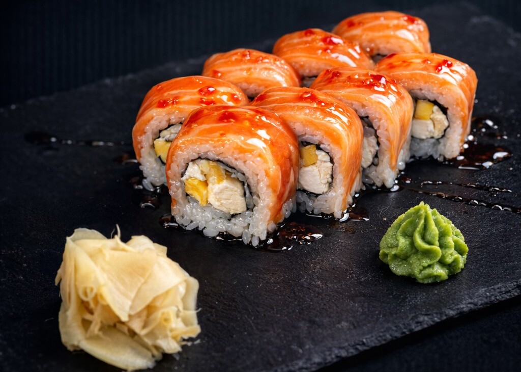 Ролл с лососем и манго — нежный вкус с лёгкой сладкой ноткой.