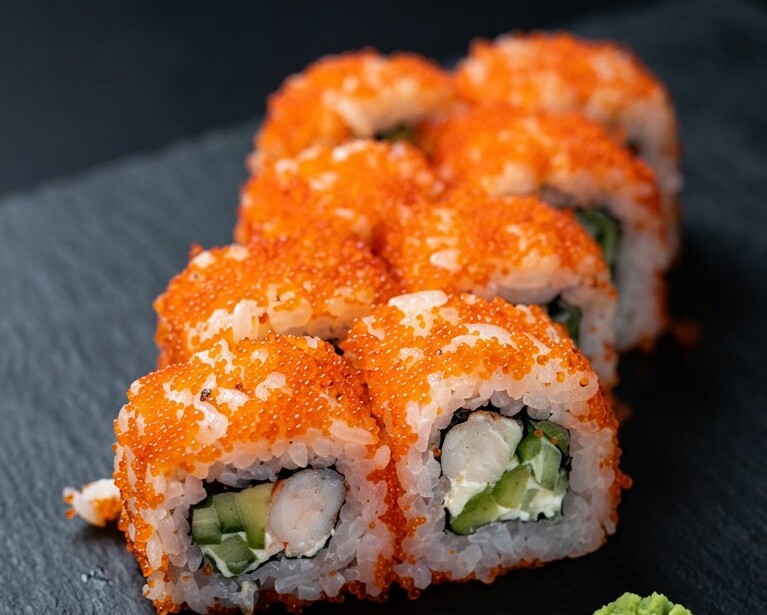 Калифорния с креветкой — популярный ролл с креветками, сливочным майонезом, авокадо и огурцом. Икра тобико делает вкус более насыщенным и гармоничным.
