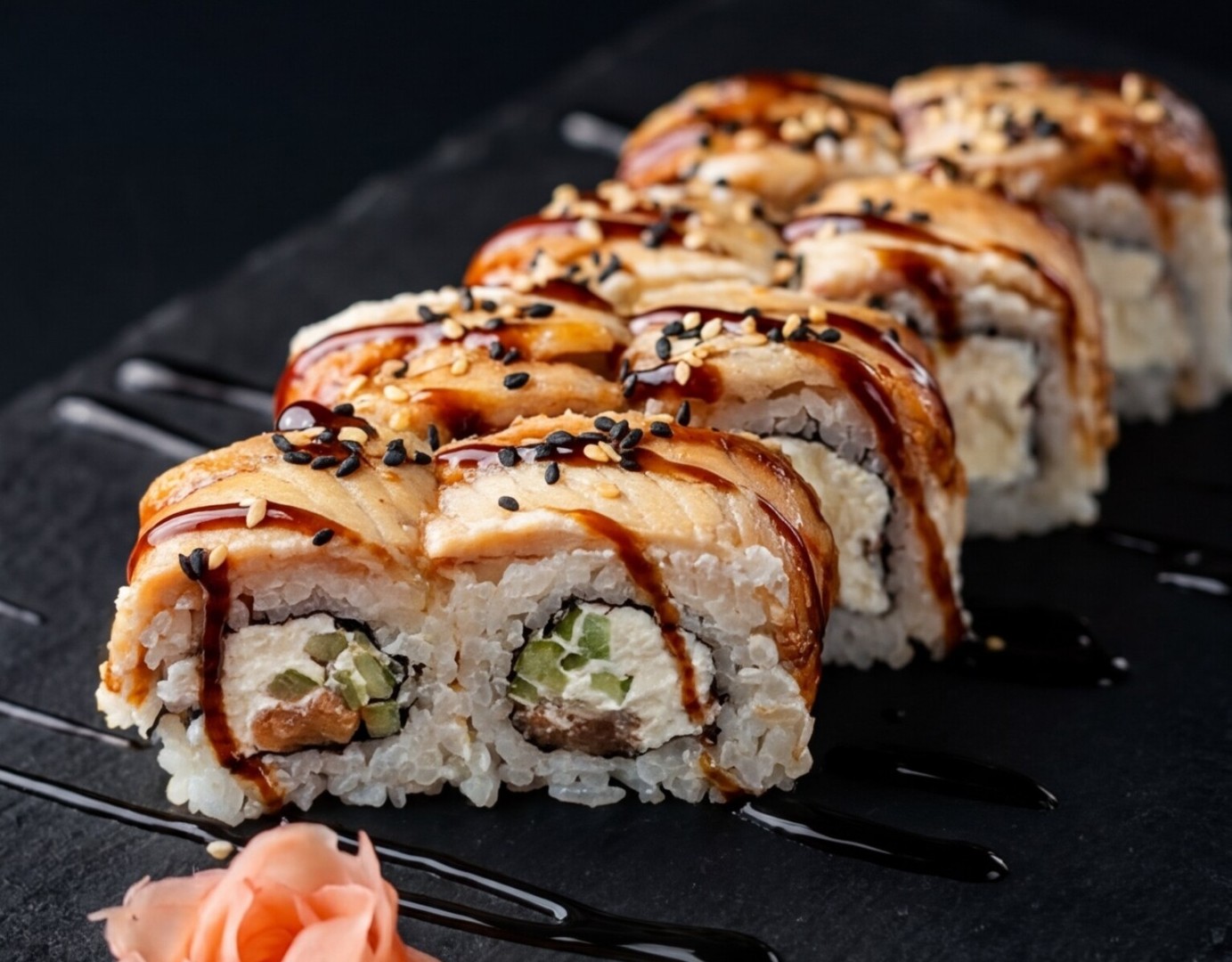 Ролл с угрём и лососем — насыщенный вкус с лёгкой сладостью.