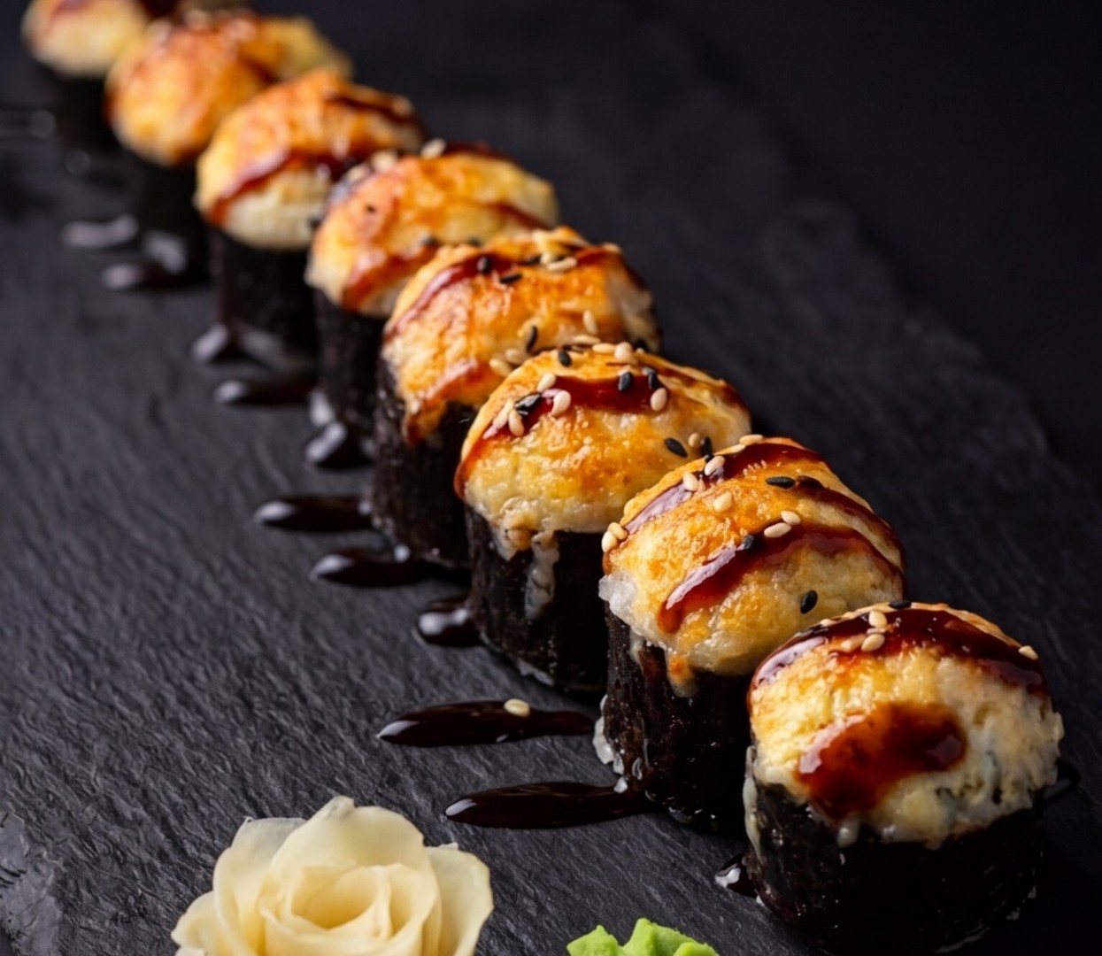 Ролл с крабом и унаги — насыщенный вкус с лёгкой сладостью.