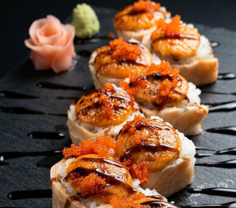 Ролл Запечённый Ойси — сочетание лосося, креветки и сливочного сыра в тёплом исполнении. Икра тобико и соусы унаги и спайси делают вкус ярким, насыщенным и выразительным.