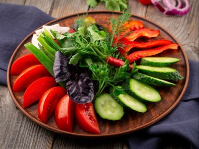 Закуска «Овощи с зеленью» — свежий и хрустящий выбор для вашего стола! В блюде — сочные узбекские томаты, огурцы, лук, болгарский и острый перец. Идеальный вариант для лёгкого перекуса или дополнения к основному блюду!